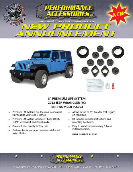 Get 35" tires on your JK for Under $170 with a Performance Accessories Premium Lift System.