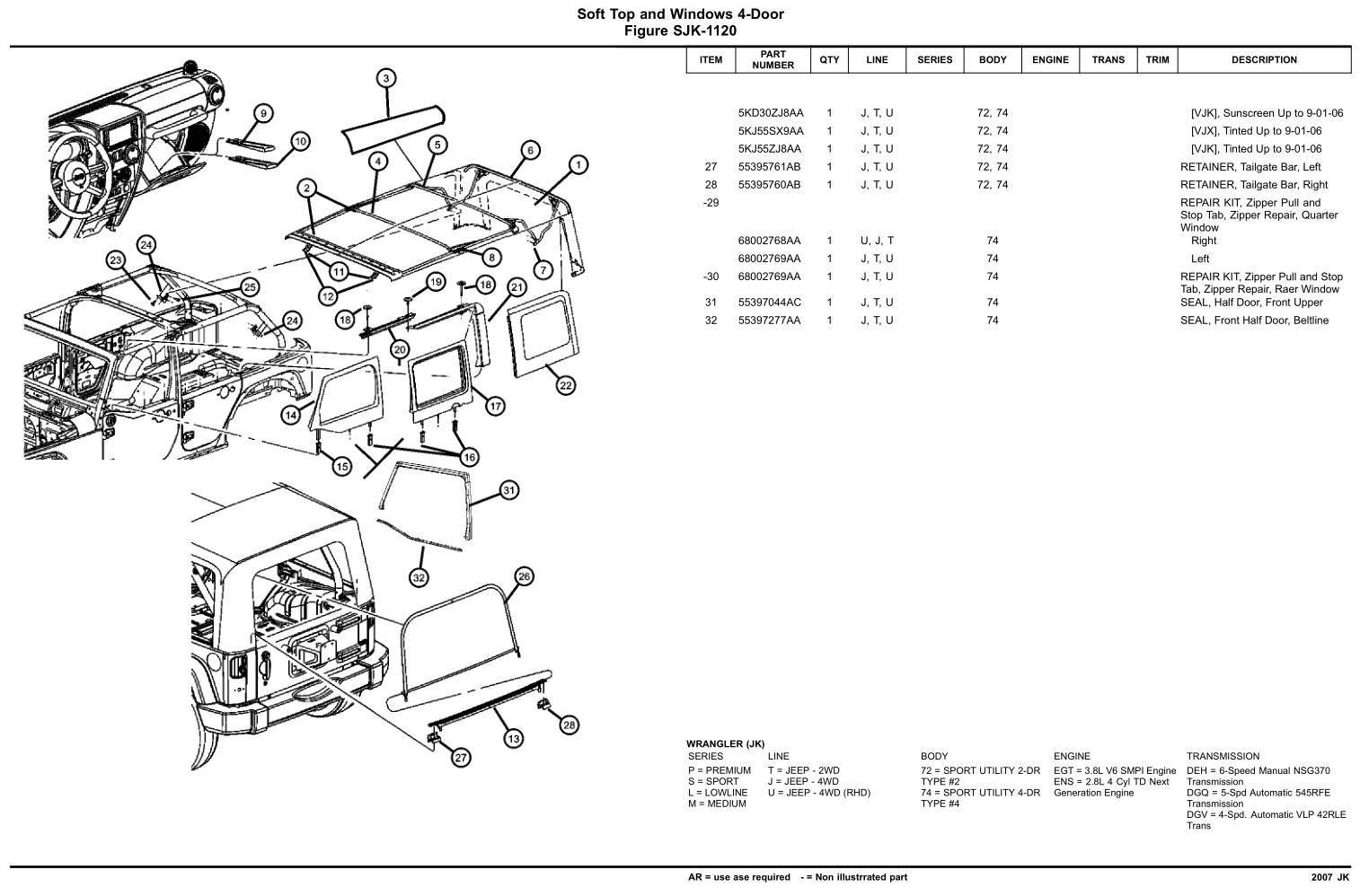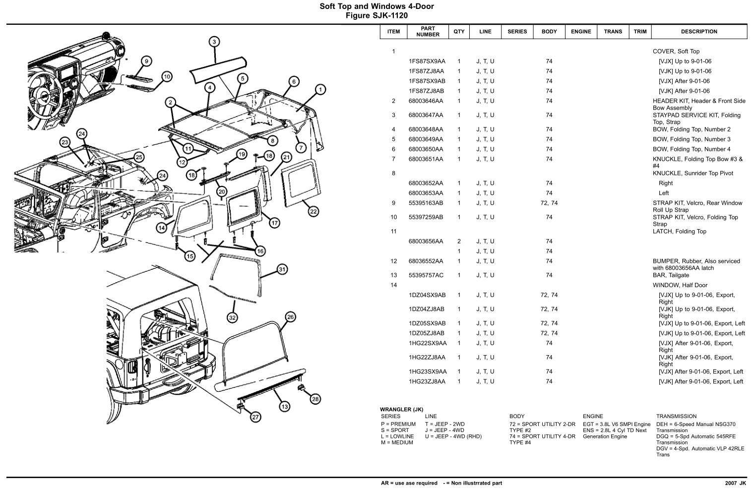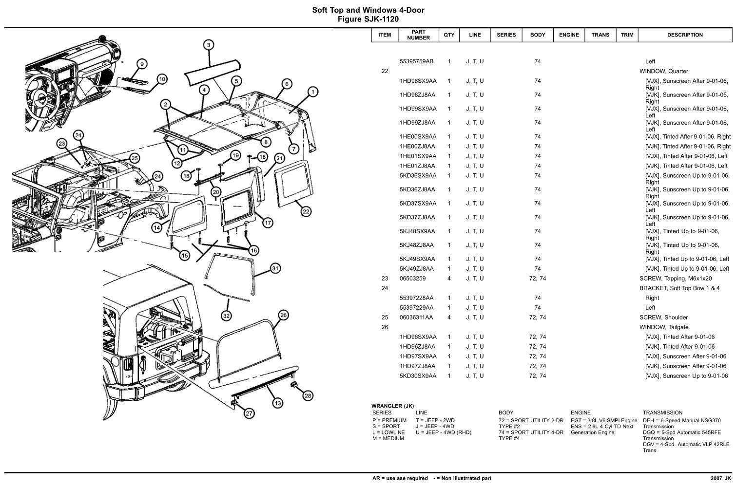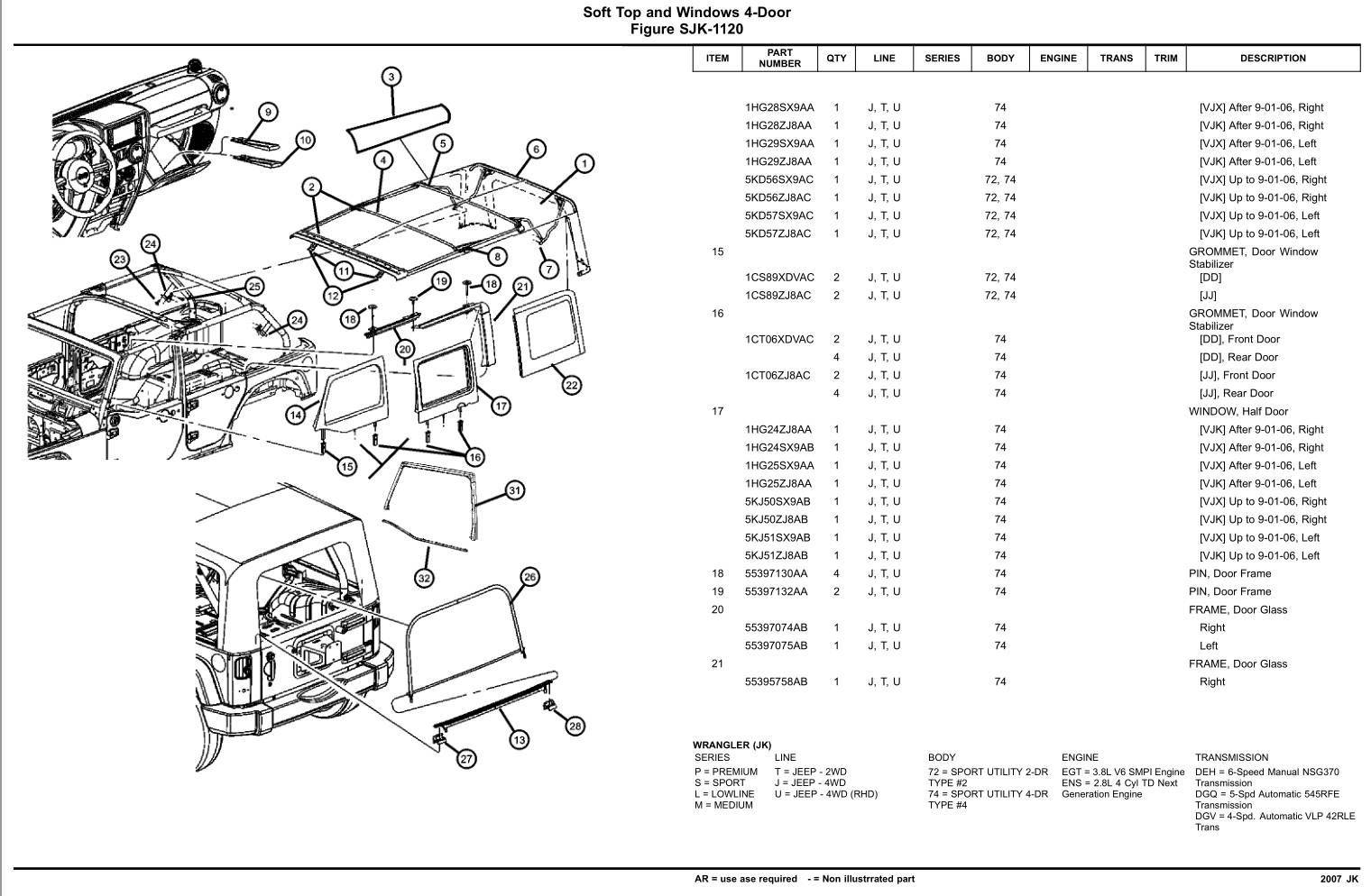 I've found that those online diagrams are horribly tiny. This is for the 2007 JK, so not sure it has exactly the part you describe (I can't figure it out from your verbal description, but I haven't had my soft top on my JK in years. Too much involved with all of the overlanding mods I now have on it). Anyway, maybe this will help you ...