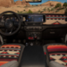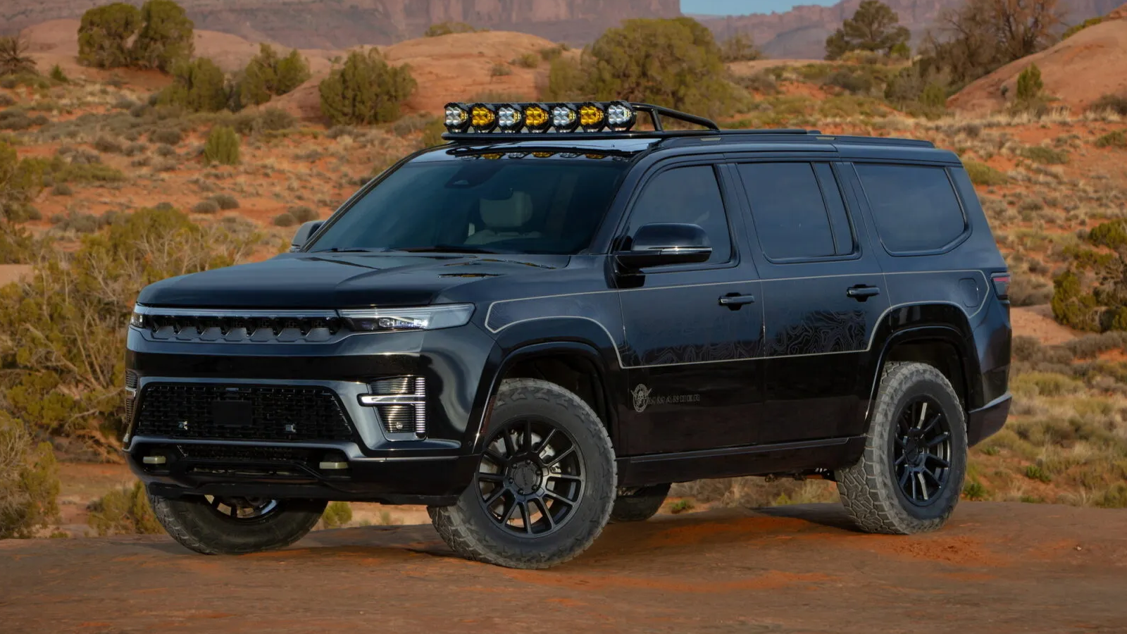 Styling elements also reference classic Wagoneers. The body graphics reinterpret the woodgrain panels seen on vintage models, replacing them with topographic lines inspired by Canyonlands National Park. The same map pattern even appears on the panoramic roof.