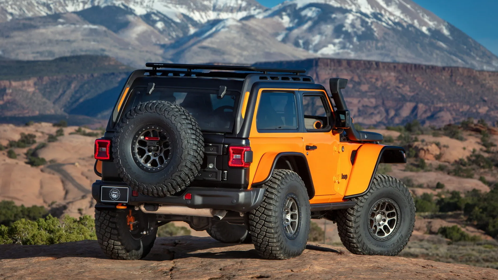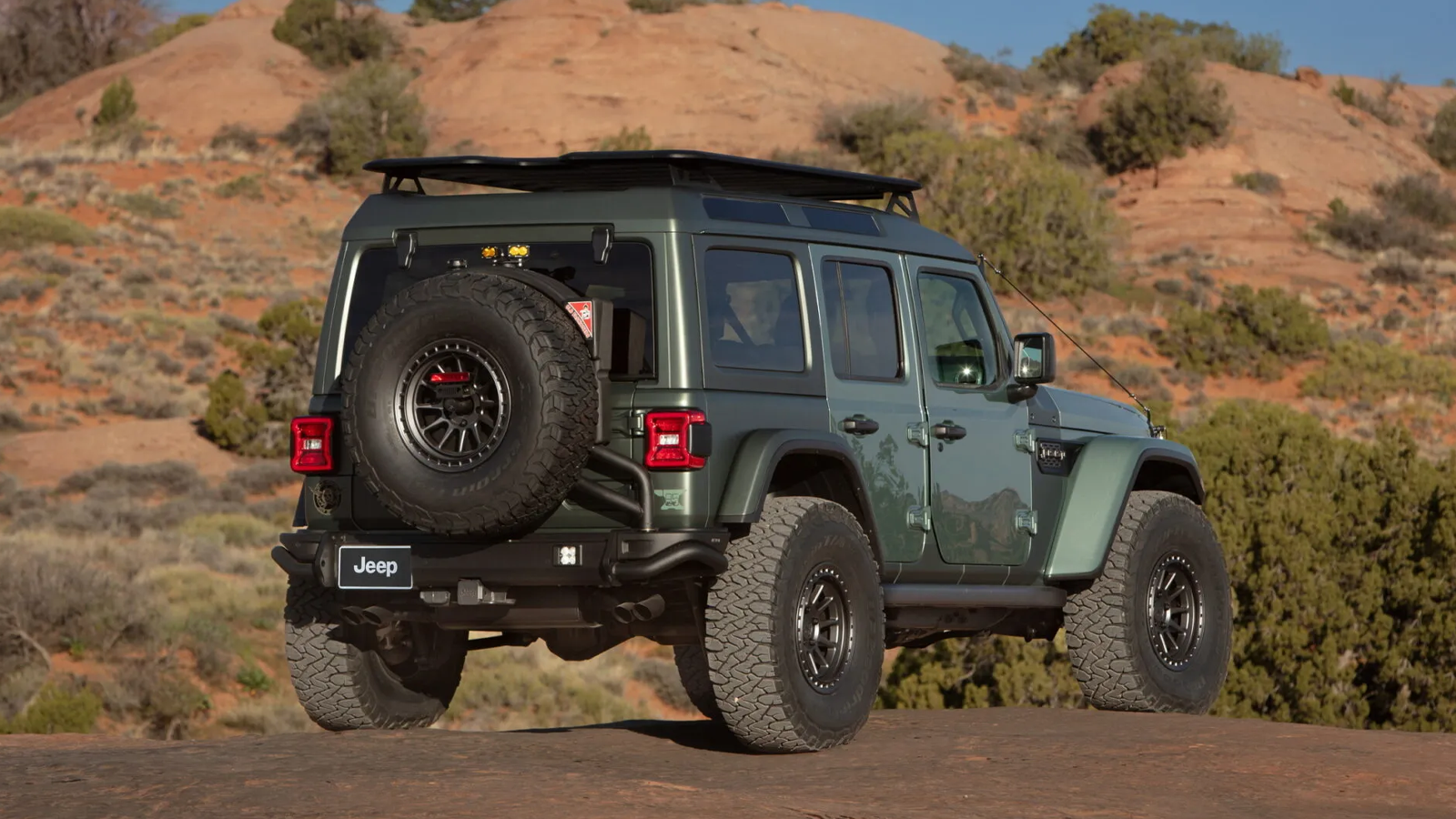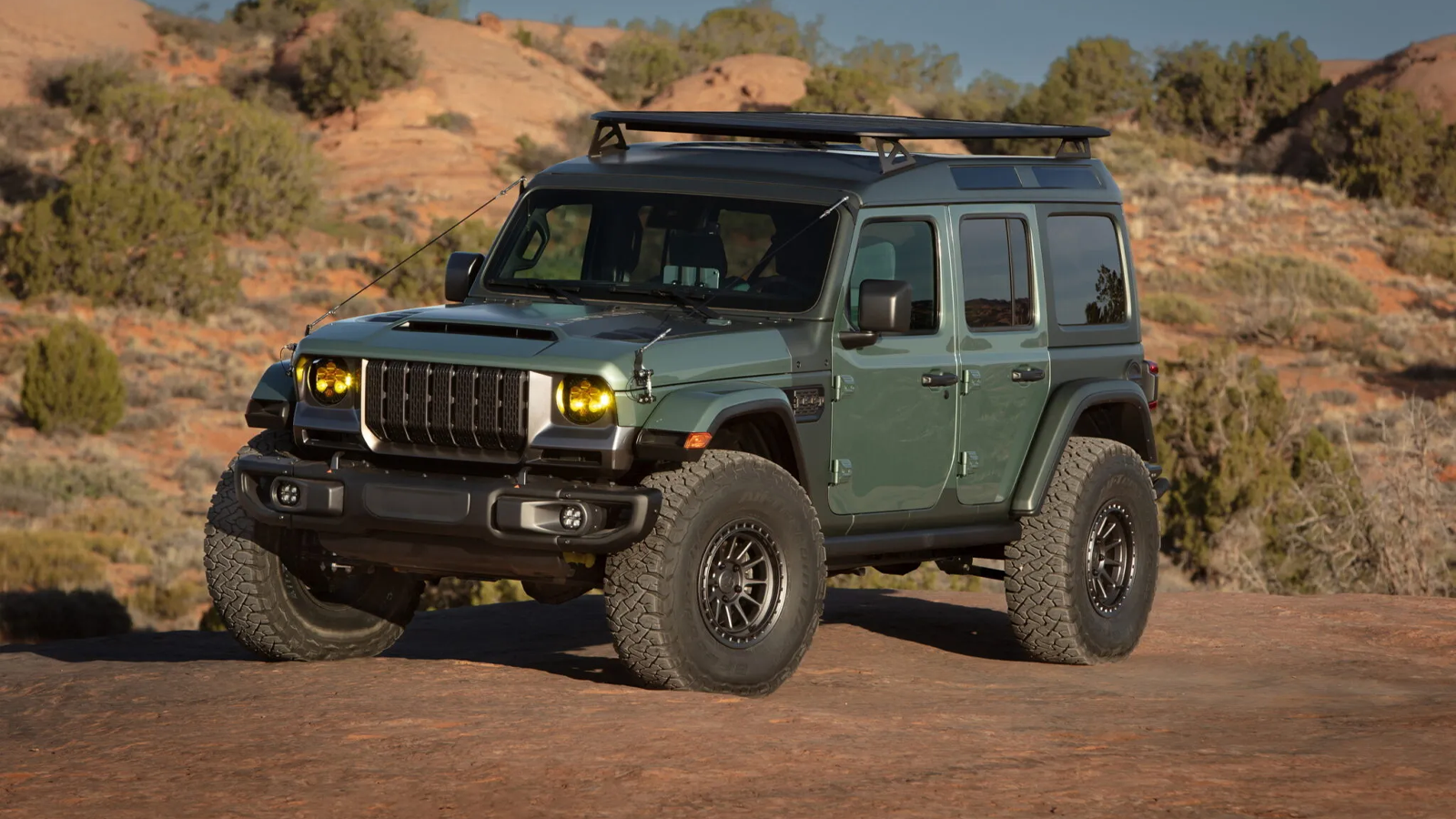 The concept rides on the chassis of a Jeep Wrangler Rubicon 392, powered by a 470-horsepower 6.4-liter V-8. A fixed roof adds about four inches of headroom and incorporates four skylights, giving the interior a more expedition-style layout. Heavy-duty steel bumpers, rock rails, and 37-inch BFGoodrich Mud-Terrain tires prepare it for trail use, while auxiliary lighting and an onboard air system help with night driving and tire-pressure adjustments.