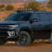 A suspension lift from Rock Krawler allows the SUV to ride on 35-inch all-terrain tires mounted to black 20-inch wheels. Custom skid plates protect the underbody, while a roof rack carrying multiple auxiliary lights helps illuminate remote trails at night.