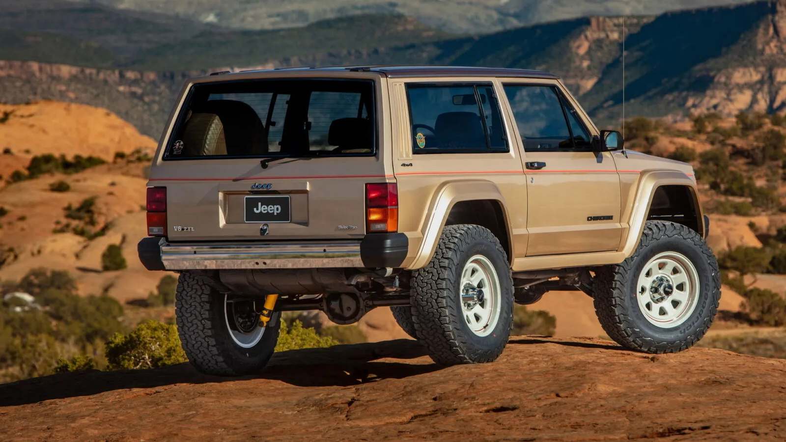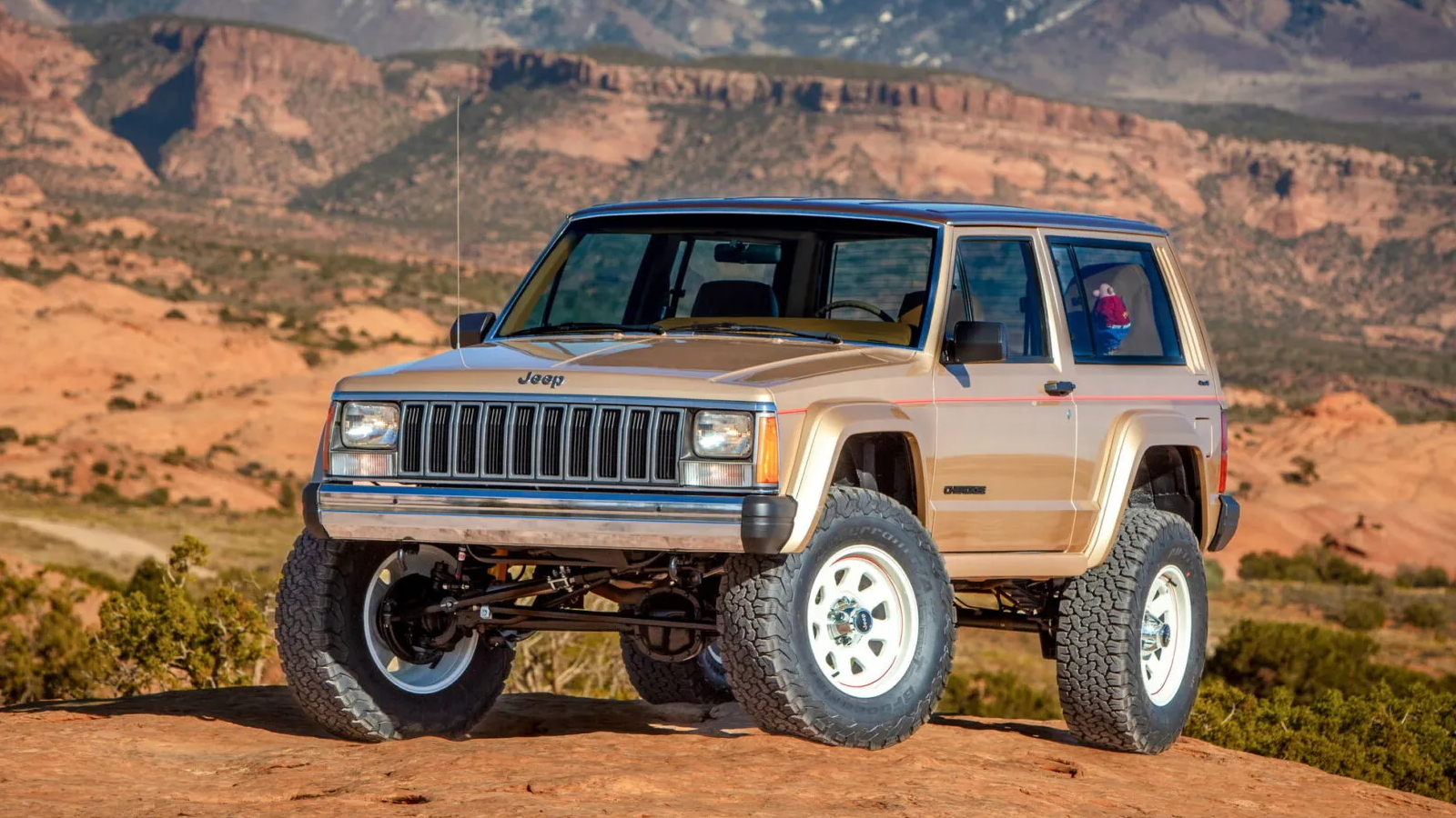 One of the most nostalgic concepts is the XJ Pioneer, a lightly modified restomod built from a two-door Jeep Cherokee (XJ) originally sold in Reno in the mid-1980s. The donor vehicle had just 80,000 miles and came with meticulous records documenting every fuel fill-up over decades of ownership. Because the SUV was so well preserved, Jeep’s design team kept the factory Champagne gold paint and the original 2.8-liter V-6.