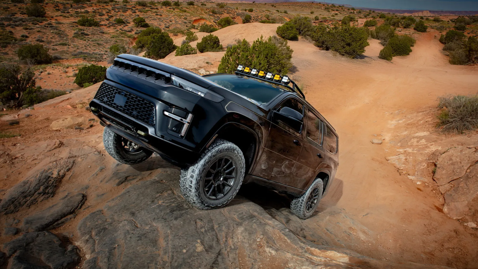 The final concept explores how Jeep’s largest luxury SUV might fit into serious off-roading. The Grand Wagoneer Commander begins with the three-row Jeep Grand Wagoneer but adds hardware intended to make it more capable in rough terrain.