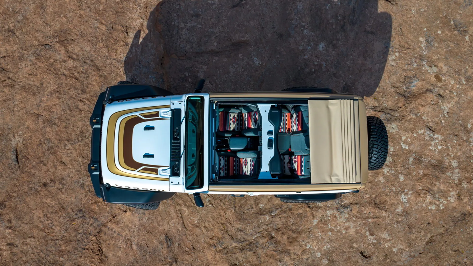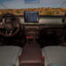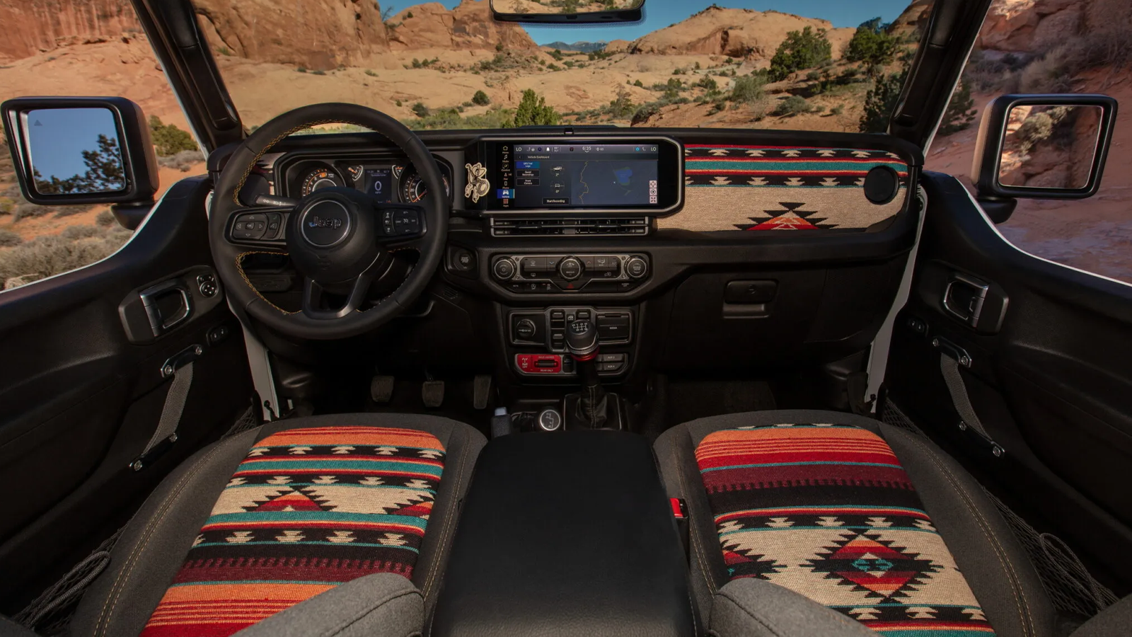 Inside, Jeep embraced a minimalist approach. Vinyl flooring replaces carpet so the cabin can be washed out after dusty trails, and the seats feature upholstery inspired by Southwestern-style textiles. Half doors and a manually operated sliding canvas roof emphasize the concept’s back-to-basics philosophy.