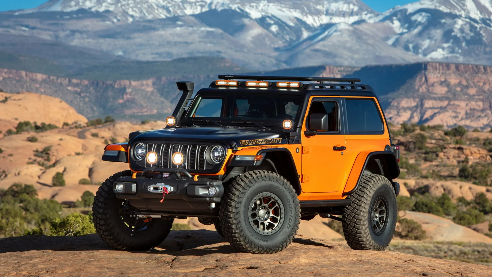The Wrangler Buzzcut concept focuses on aftermarket customization. Developed with Mopar, the two-door build features a roof chopped two inches lower than stock and a windshield laid back for a more aggressive stance. Combined with a 2-inch suspension lift and 37-inch tires, the result is a squat, muscular look highlighted by flat fenders and steel bumpers.
