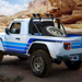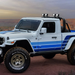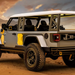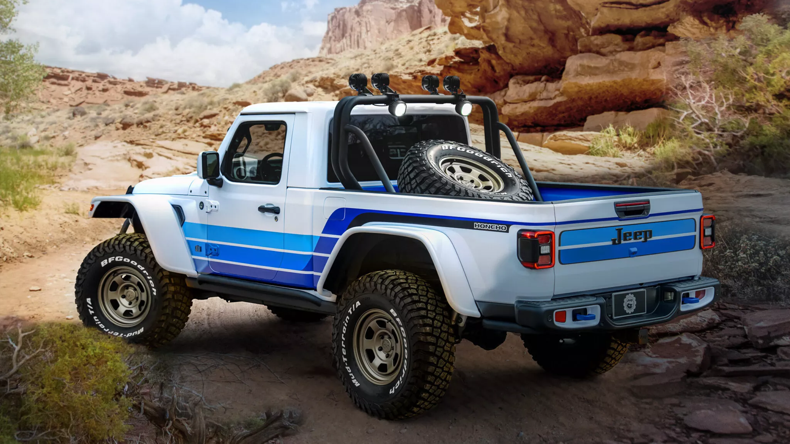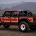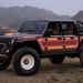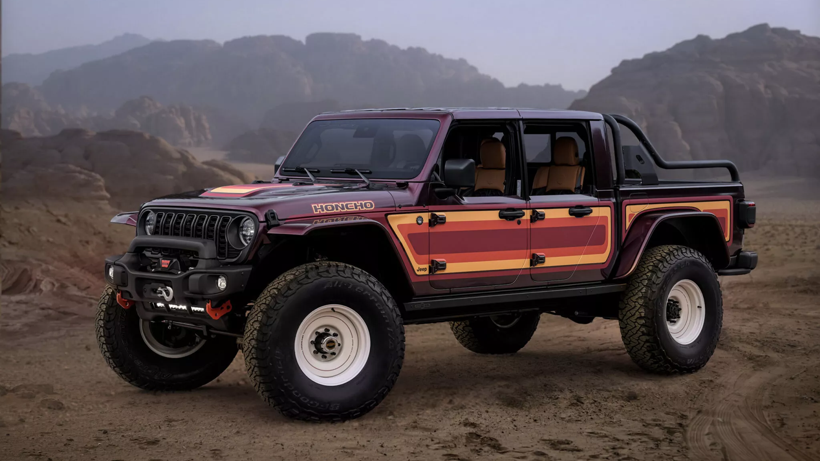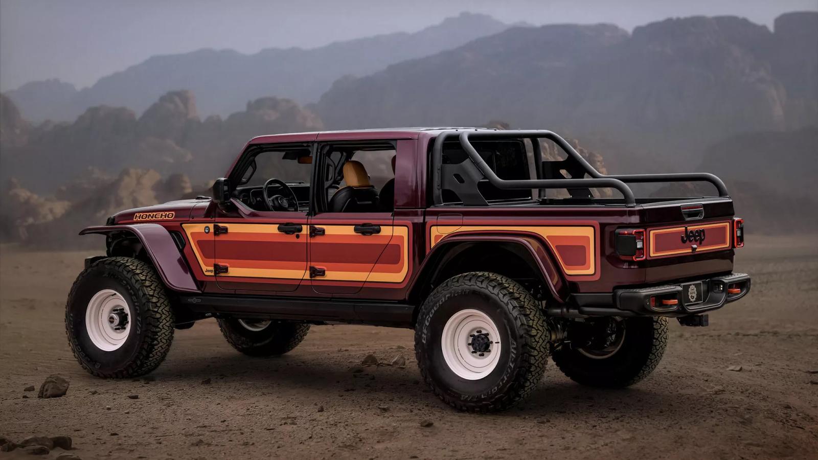 Revisiting the idea of a short-cab pickup, the J6 Honcho rides on a Rubicon chassis but stretches the rear into a full six-foot bed—longer than a standard Gladiator’s. Its 118.4-inch wheelbase matches that of a four-door Wrangler, and with just a 2-inch lift, it fits 37-inch BFGoodrich KM3s under flat Mopar concept fenders.