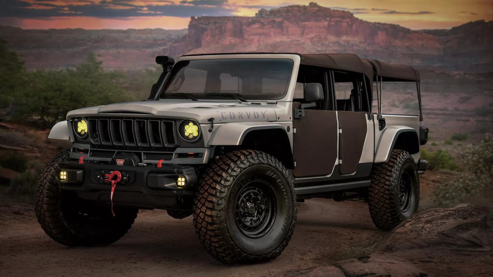 Perhaps the most overtly nostalgic, the Convoy Concept reimagines the old SJ Gladiator with a distinct military look. Based on the Gladiator Mojave, this one-off uses a J-truck-style hood and a seven-slot grille inspired by early Wagoneer designs. It features matte Ghost Ops paint, brown canvas half doors and roof, and a 12,000-pound Warn winch.