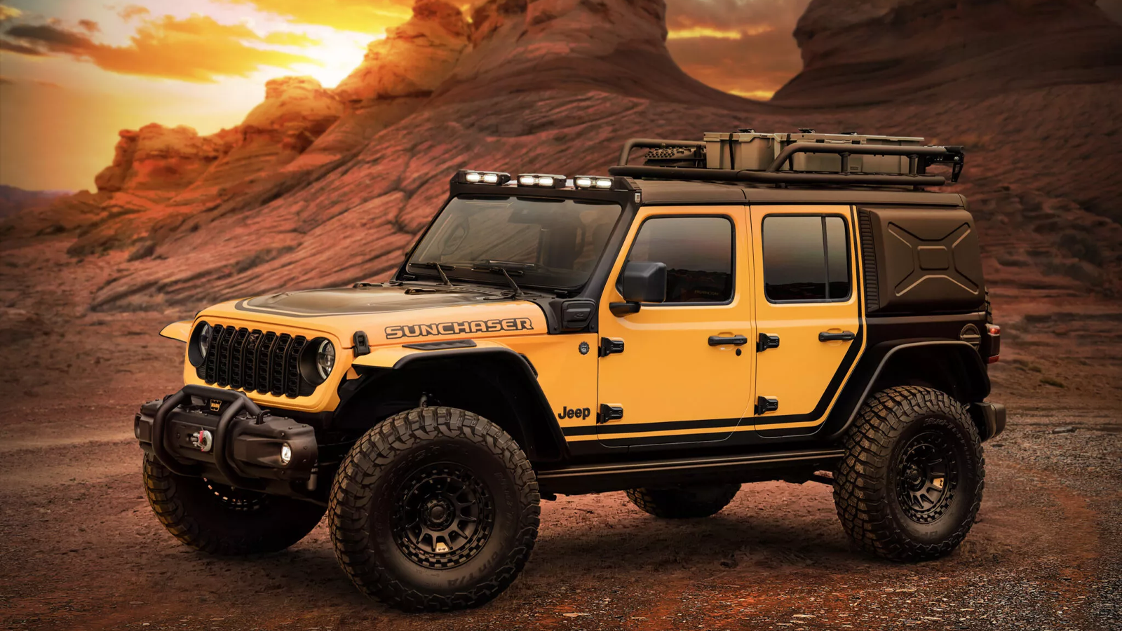 The Sunchaser, based on the Wrangler 4xe Rubicon, is outfitted for sunup-to-sundown adventures. Side-mounted storage boxes recall those seen on old-school Land Rovers, and the 2-inch lift accommodates 37-inch BFGoodrich KM3 tires. Lighting upgrades include a roof rack system and Mopar’s “ILLUMINAT3” pivoting light bar—clearly a concept piece but perhaps hinting at production.