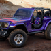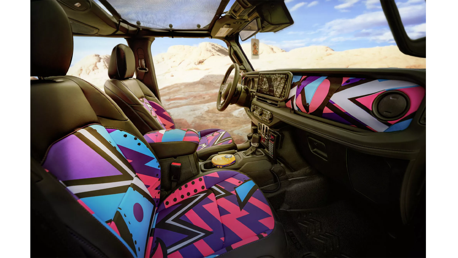 Jeep’s Rewind Concept throws it back to the ’80s and ’90s, a time when boxy Wranglers wore splashy graphics and neon interiors. Starting with a two-door Wrangler Rubicon, the design team chose a bright Grimace purple paint job and gave it vintage-style graphics reminiscent of jazz cup patterns.