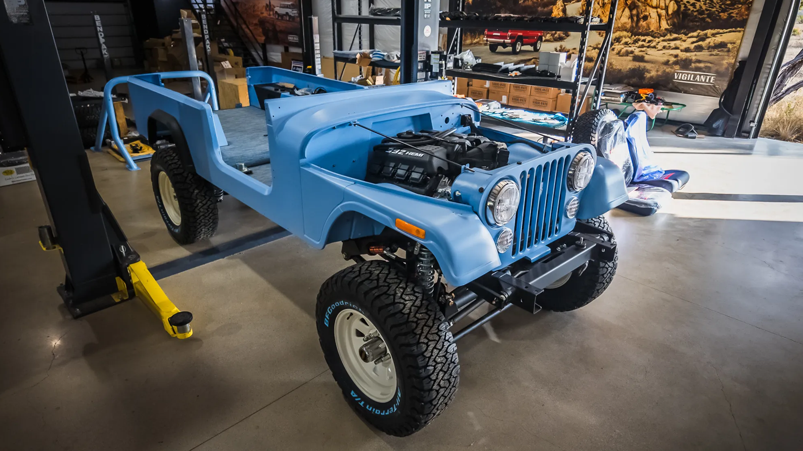 Each build begins with an original CJ-8 donor, which is stripped down to its bare structure before being rebuilt from the ground up. Vigilante replaces the factory underpinnings with a custom chassis co-developed with Roadster Shop, designed to handle far more power and improve overall rigidity. The setup includes Dana 44 front and Dana 60 rear axles, paired with a four-link suspension that replaces the original leaf springs, signaling a clear shift from vintage utility to modern performance.