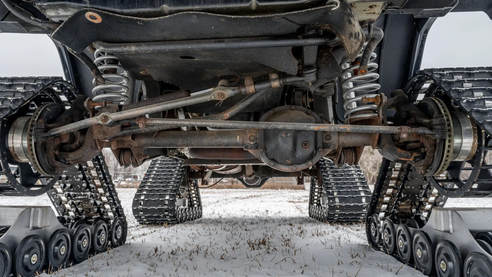 The standout feature of this Jeep Cherokee Sport is the installation of a Dominator Track System from American Track Truck. These tracks, bolted onto the original hubs, boast steel frames, drive drums, bogie wheels, and rubber tracks. The suspension has been adjusted to accommodate these enhancements while retaining the original front and rear brakes. The seller provides insight, stating, "Given how high the Jeep sits, you'd probably be hard-pressed to find a jack that could lift it high enough to remove the tracks, meaning a lift is probably needed to fit the original wheels."